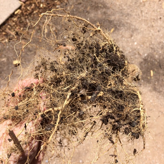 So, cut to now. In mid-July the huckleberry was removed from its planter. Remember how I said these have thick and shallow root systems? I was not at all joking. From now on they will have no place in my containers. Just look at these things.